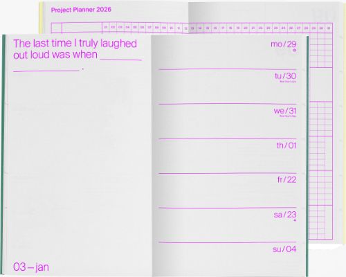 The 2026 Day One to One Day planner has a visually clear layout, with dedicated space to organize tasks and notes. It keeps things practical while adding a touch of surprise: Each week features a playful sentence with blanks to fill in, encouraging self-reflection, sparking conversations or laughter—like when discovering the weirdest thing one is really good at. With its structured layout and plenty of room for to-do lists on the left page, this planner will be a witty and faithful companion throughout 2026.Contains weekly and monthly overviews, yearly overview 2025-26, project planner, blank pages. It is printed in Germany, in the most sustainable possible way.